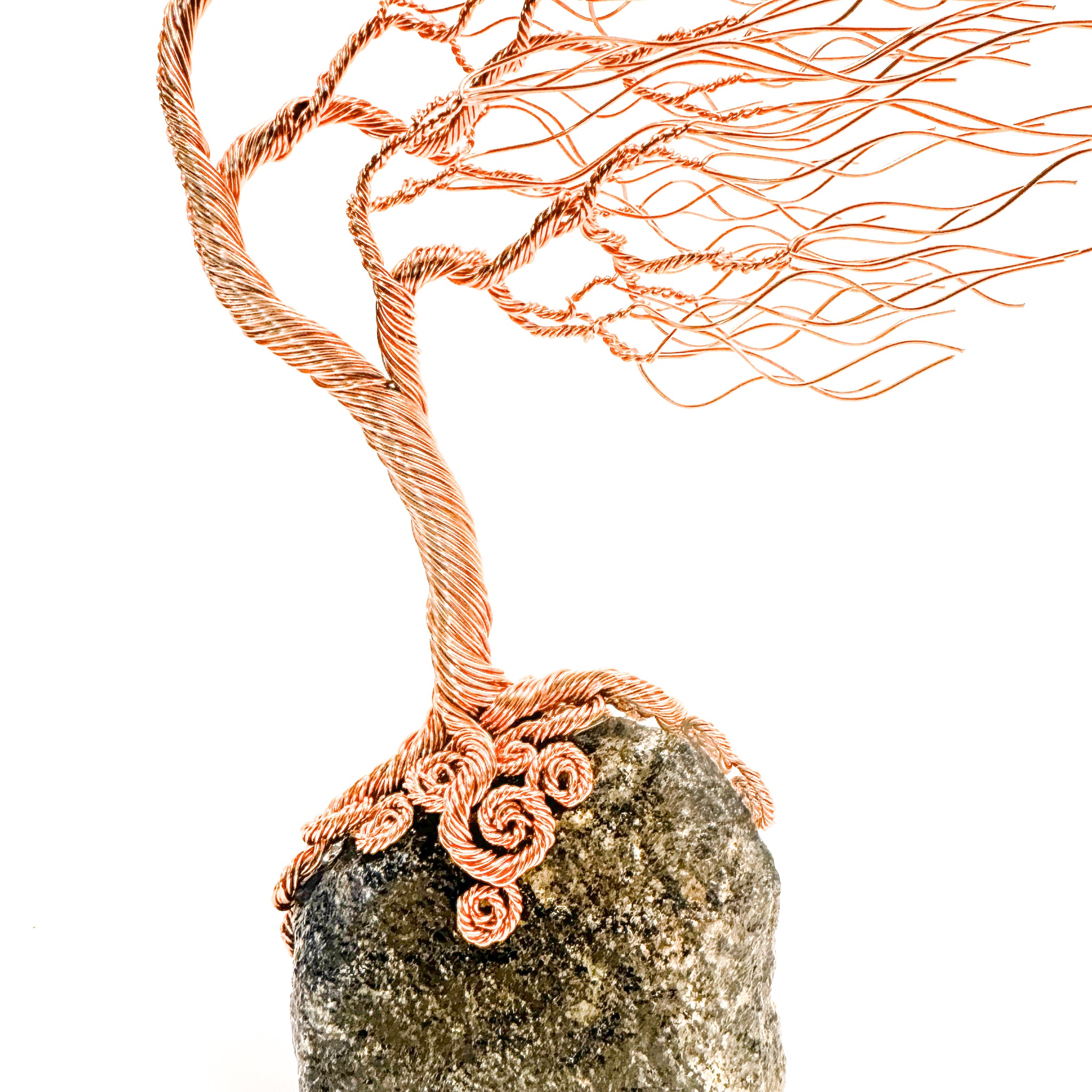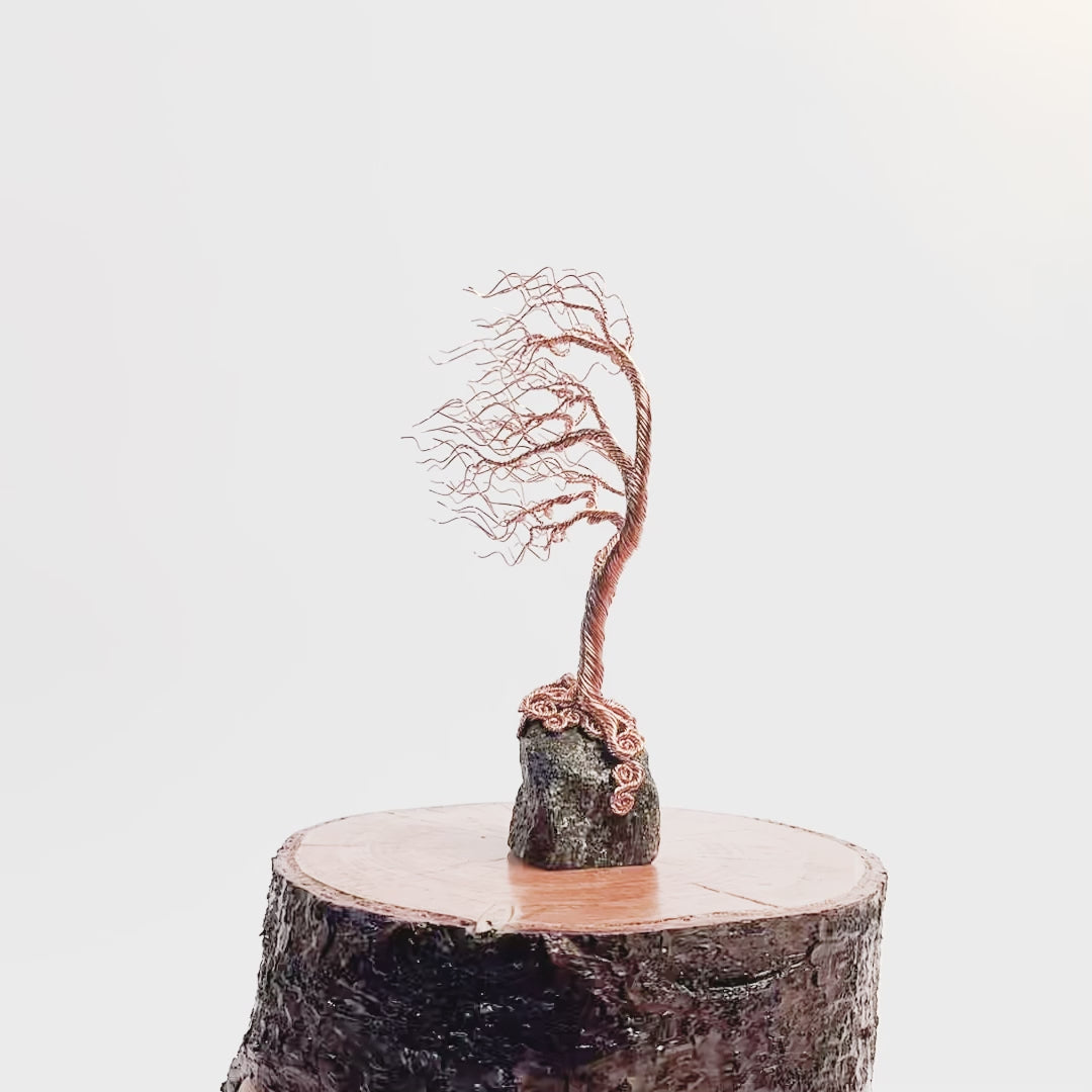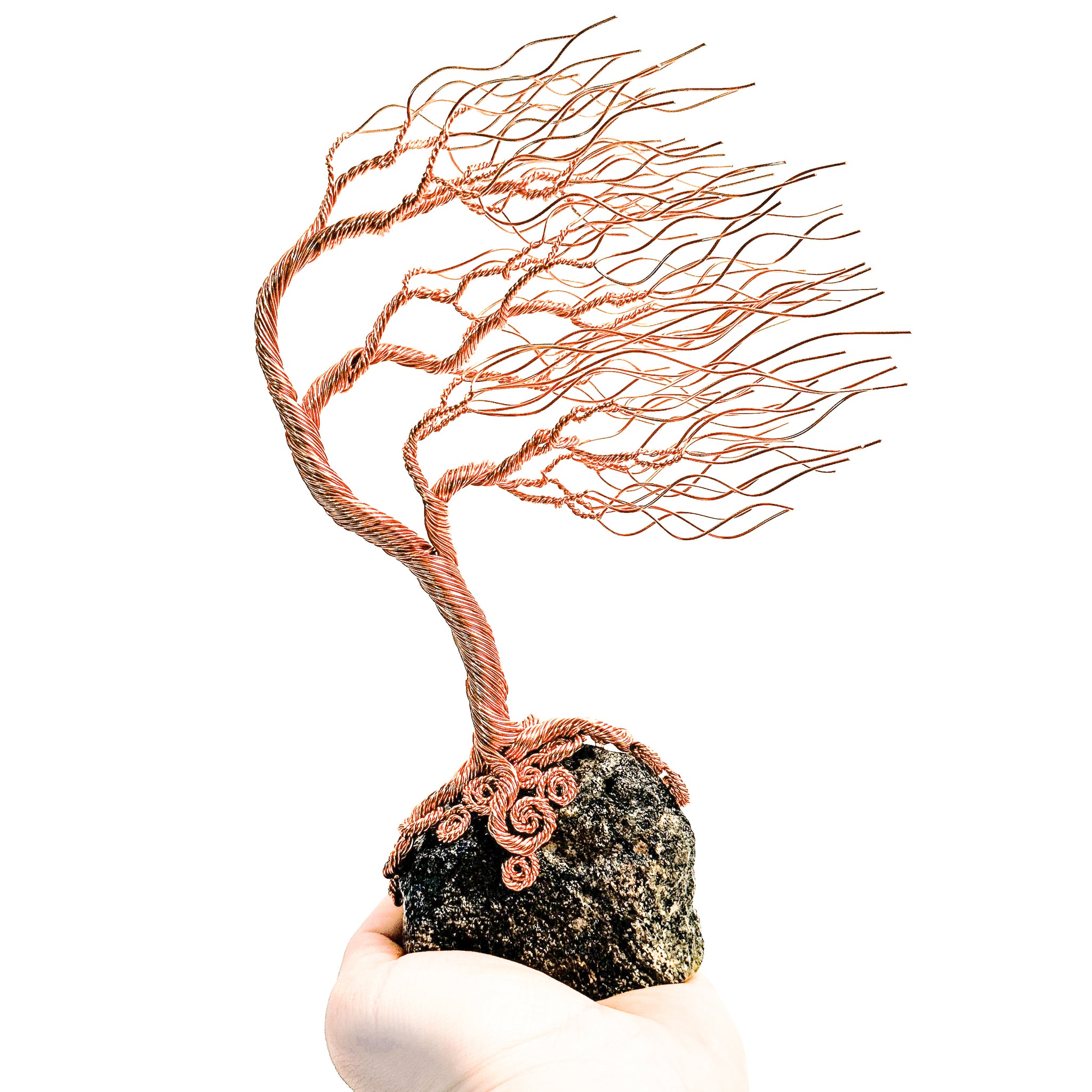 This Windswept Willow tree sculpture is formed from twisted copper wire and mounted on a rock. It measures 23cm tall by 15cm wide. This delicate copper sculpture is set on a rock base that has been diamond cut and polished giving it a lustrous flat base on which to balance. It is intricately handmade through twisting and looping enameled copper wires together to form the trunk, branches and leaves. Certificate of Authenticity included.