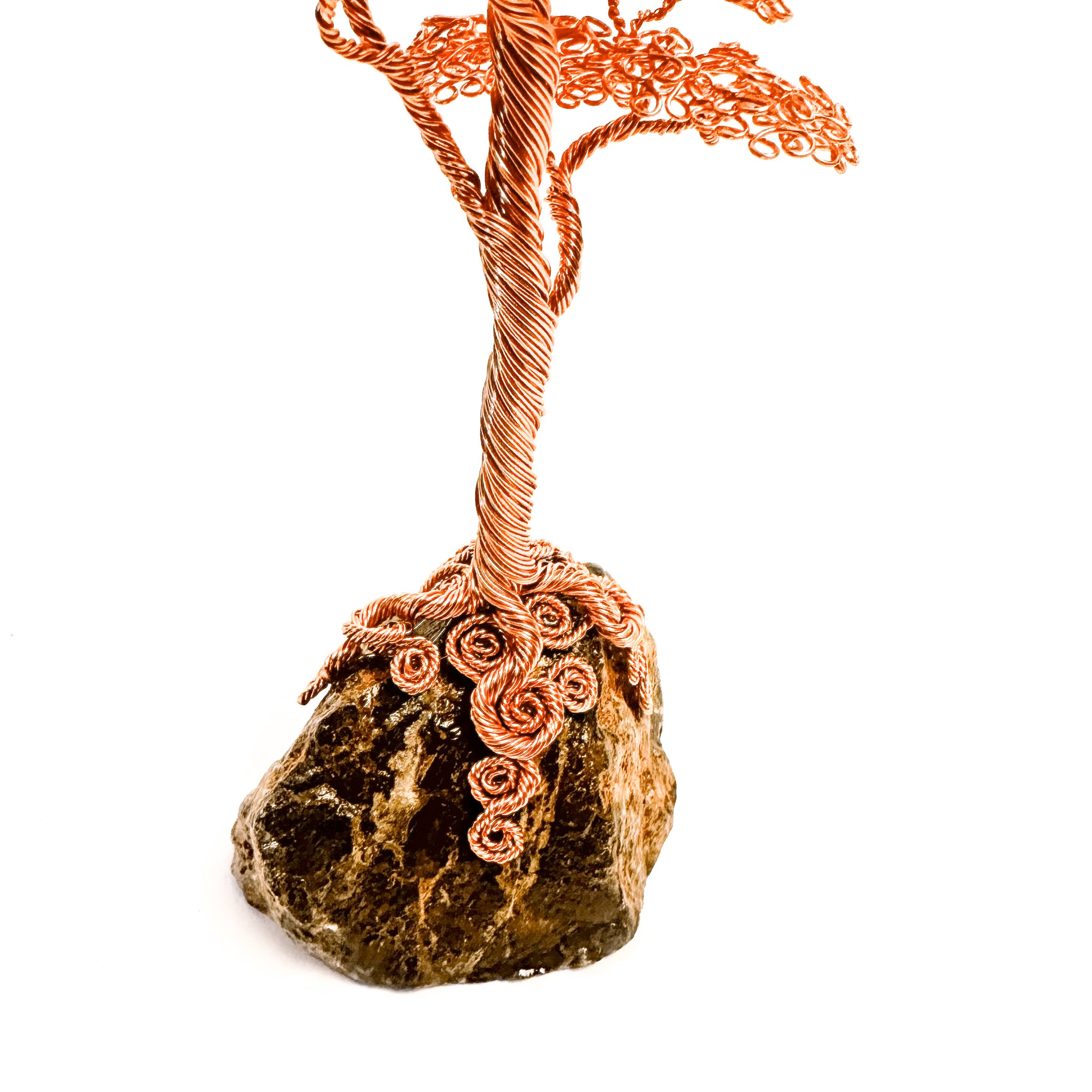 "Uplift" is formed from twisted copper wire and gorgeous Muskoka granite rock. The granite base has been diamond cut and polished giving it a lustrous flat base on which to balance. This delicate copper sculpture measures 26cm tall by 8cm wide. It is intricately handmade through twisting and looping enameled copper wires together to form the trunk, branches and leaves.